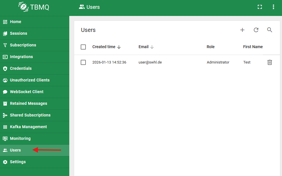Die Nutzerverwaltung in TBMQ befindet sich unter dem Reiter "Users". Hier sind alle angelegten Nutzer einsehbar. Es existiert lediglich die Nutzergruppe "Administratoren" - entsprechend ist jeder angelegte Nutzer automatisch Administrator mit Vollzugriff auf das gesamte System.