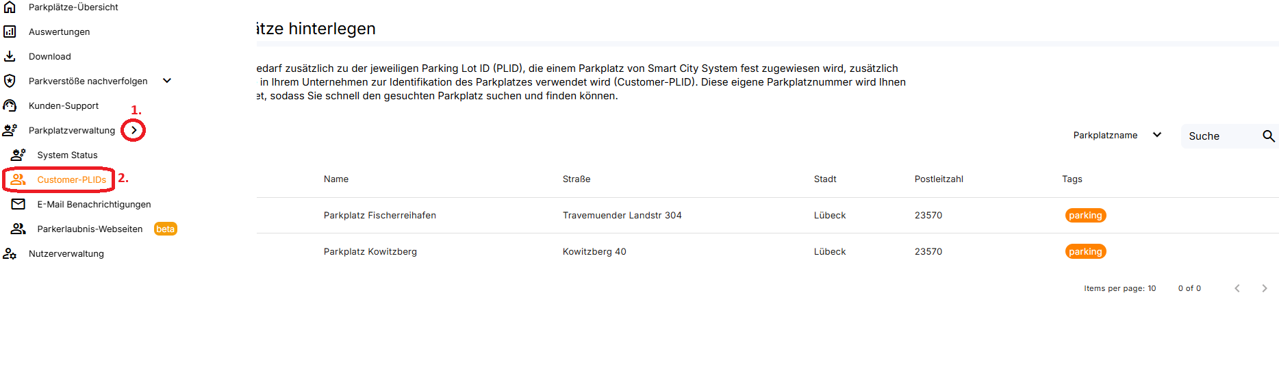Im zweiten Reiter „Customer-PLIDs“ können Sie zusätzlich zur fest vergebenen Parking Lot ID (PLID) eine eigene Parkplatznummer hinterlegen. Diese wird in der Parkplatzübersicht angezeigt und erleichtert die Identifikation innerhalb Ihres Unternehmens.