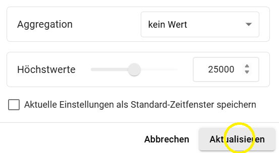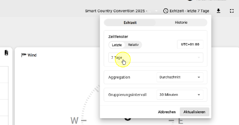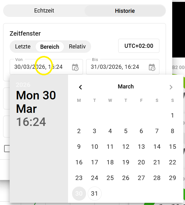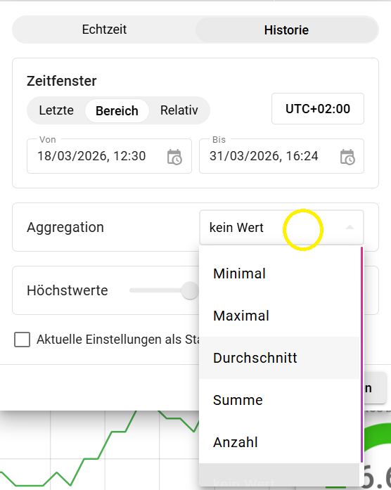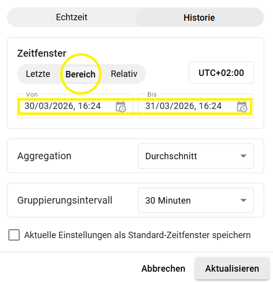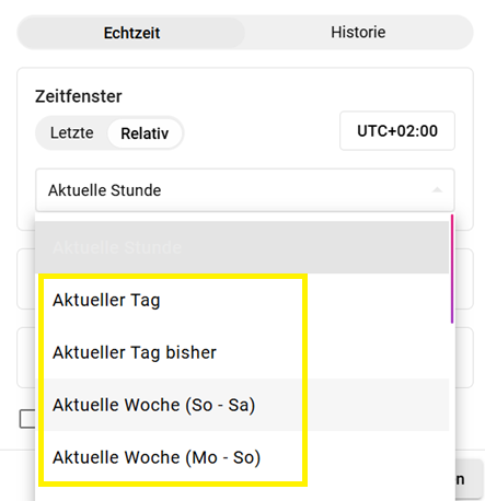 Hier lässt sich aus vordefinierten Zeitbereichen auswählen. Beispielsweise "der aktuelle Tag" der "aktuelle Tag bisher" oder auch verschiedene Wochen-, Monats- oder Jahresbereiche.