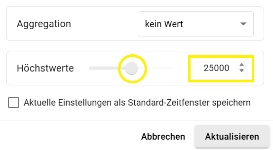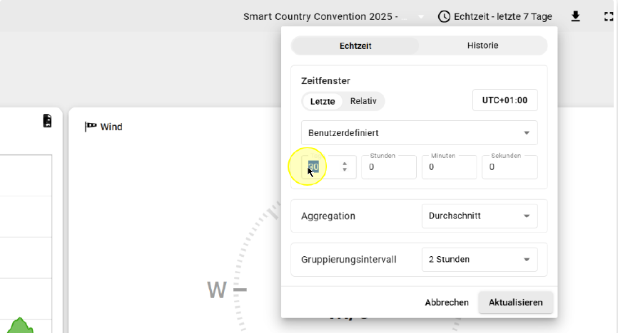 In dem meisten Dashboards ist es ihnen möglich, den Zeitbereich anzupassen in welchem Sensorwerte angezeigt werden sollen. Hierbei stehen Ihnen mehrere Optionen zur Verfügung.