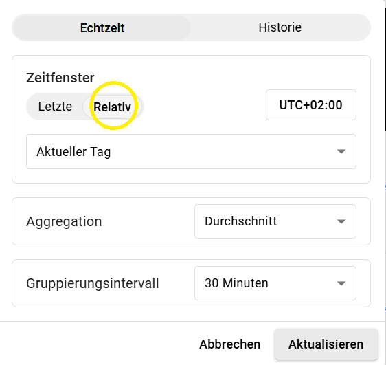 Soll hingegen ein relativer Zeitbereich angezeigt werden, können Sie im Zeitfenster von "Letzte" zu "Relativ" wechseln.